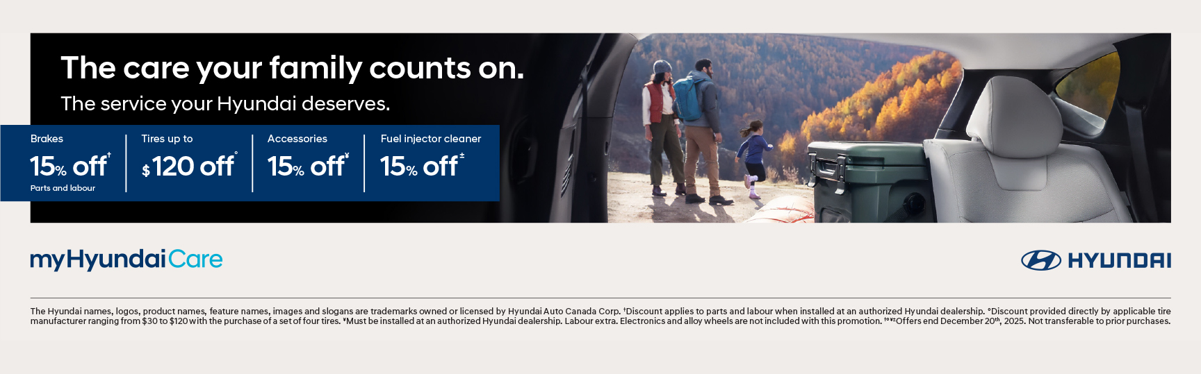 †Finance offers available O.A.C. from Hyundai Financial Services based on new in-stock 2025 TUCSON Ultimate HEV AWD with an annual finance rate of 3.99%. Cost of borrowing is $3,613. Selling price is $49,137. Weekly payments are $225 for 48 months. $2,295 down payment required. Trade-in value may be applied to down payment amount. Finance offers include Delivery and Destination charge of $2,000, levies and all applicable charges (excluding HST, GST/PST). This offer example excludes Federal Government Electric Vehicle Incentive and any provincial Government Electric Vehicle Incentive. Finance offers exclude registration, insurance, PPSA, license fees and dealer admin. fees of up to $599. Fees may vary by dealer. ^2025 TUCSON Ultimate HEV AWD finance offer includes a 0.5% Hyundai finance loyalty rate reduction. All current owners (and immediate family members with proof of residence at owner’s address) of a Hyundai or Genesis vehicle who present active (not expired) proof of ownership at time of purchase or lease are entitled to a reduction of 0.5% on the applicable finance, a reduction of 1% on the applicable lease rate, or an after-tax rebate up to $500 for cash purchases (collectively, “Loyalty Incentive”). The rate reduction and cash rebate cannot be combined. Finance rate after 0.5% rate reduction cannot be less than 0%. Lease rate after 1% rate reduction cannot be less than 0%. Loyalty Incentive can be claimed once in total from owner and immediate family member at same address. Cash price does not include freight, delivery and destination, registration, insurance, license fees, PPSA and all applicable fees, levies, charges and taxes. Dealer may sell for less. Inventory is limited. Dealer order may be required. Loyalty Incentive is subject to change or cancellation without notice. Loyalty Incentive offer is valid until January 2, 2026, and is only available in Canada. **Bonus price adjustments of $1,000/$7,000/$2,000 available on 2025 KONA Electric/2024 IONIQ 5/2025 IONIQ 6 vehicles only, on lease, finance and cash purchase until May 31, 2025. Price adjustments are applied before taxes. Offer is non-transferable and cannot be assigned. Model inventory for which the price adjustments are applicable may vary from dealer to dealer and from region to region. See your local Hyundai dealer for further details and applicable model inventory. †Finance offers available O.A.C. from Hyundai Financial Services based on new in-stock 2025 ELANTRA Essential/2025 SONATA Preferred Trend/2025 VENUE Essential/2025 KONA Essential FWD/2025 TUCSON Preferred AWD/2025 SANTA FE Preferred Hybrid AWD/2025 PALISADE 3.8L Preferred AWD/2025 SANTA CRUZ Preferred AWD/2025 KONA Electric Preferred/2024 IONIQ 5 Preferred Long Range/2025 IONIQ 6 Preferred Long Range with an annual finance rate of 5.29%/5.29%/5.29%/4.79%/5.29%/5.29%/5.29%/5.29%/3.49%/1.99%/2.79%. Cost of borrowing is $4,224/$6,360/$4,219/$4,685/$6,663/$8,422/$9,952/$8,174/$5,802/$3,434/$5,225. Selling price is $28,773/$41,559/$27,643/$33,259/$43,487/$53,096/$62,646/$52,298/$54,826/$53,558/$60,349. Weekly payments are $70/$105/$70/$85/$110/$140/$165/$135/$140/$140/$155 for 84/84/84/84/84/84/84/84/84/84/84 months. $4,224/$3,195 /$2,195/$2,395/$3,295/$2,295/$2,595/$2,995/$3,895/$2,495/$3,895 down payment required. Trade-in value may be applied to down payment amount. Finance offers include Delivery and Destination charge of $1,825/$1,975/$2,000/$2,000/$2,000 /$2,050/$2,050/$2,050/$2,000/$2,000/$2,000 levies and all applicable charges (excluding HST). Finance offers exclude registration, insurance, PPSA, licence fees and dealer admin. fees of up to $599. Fees may vary by dealer. ◊Leasing offers available O.A.C. from Hyundai Financial Services based on a new 2025 ELANTRA Essential/2025 SONATA Preferred Trend/2025 VENUE Essential/2025 KONA Essential FWD/2025 TUCSON Preferred/2025 SANTA FE Preferred Hybrid AWD/2024 PALISADE Preferred AWD/2025 SANTA CRUZ Preferred AWD/2025 KONA Electric Preferred/2024 IONIQ 5 Preferred Long Range/2025 IONIQ 6 Preferred Long Range with an annual lease rate of 6.49%/6.49%/6.79%/5.99%/6.49%/6.79%/6.79%/6.29%/4.49%/4.29%/4.49%. Total lease obligation is $15,971/$24,422/$12,258/$15,883/$22,252/$20,751/$28,918/$28,777/$31,971/$30,102/$39,696. Weekly lease payment of $60/$100/$60/$65/$90/$110/$125/$130/$110/$100/$140 for a 48/48/36/48/48/36/48/48/60/60/60-month walk-away lease. Down payment of $3,495/$3,595/$2,895/$2,295/$3,495/$3,595/$2,995/$1,795/$3,395/$3,995/$3,195 and first monthly payment required. Trade-in value may be applied to down payment amount. Lease offer includes Delivery and Destination charges of $1,825/$1,975/$2,000/$2,000/$2,000/$2,050/$2,050/$2,000/$2,000/$2,000/$2,000, levies and all applicable charges (excluding HST). Lease offer excludes registration, insurance, PPSA, licence fees and dealer admin. fees of up to $599. Fees may vary by dealer. $0 security deposit on all models. 16,000 km allowance per year applies. Additional charge of $0.12/km. ♦Price of models shown: 2025 ELANTRA N Line Ultimate/2025 SONATA N Line/2025 VENUE Ultimate/2025 KONA N Line AWD Ultimate Package/2025 TUCSON Ultimate Hybrid AWD/2025 SANTA FE Preferred Hybrid AWD Trend Package/2025 PALISADE Ultimate Calligraphy/2025 SANTA CRUZ Ultimate/2025 KONA Electric Preferred Ultimate/2024 IONIQ 5 Preferred AWD Long Range with Ultimate Package/2025 IONIQ 6 Preferred Long Range AWD Ultimate Package is $34,635/$42,785/$28,910/$42,310/$50,510/$49,655/$62,460/$53,610/$49,980/58,680/$63,780. Price includes Delivery and Destination charges of $1,825/$1,975/$2,000 /$2,000 /$2,000/$2,050/$2,050/$2,000/$2,000/$2,000/$2,000, levies and all applicable charges (excluding HST). Prices exclude registration, insurance, PPSA, licence fees and dealer admin. fees of up to $599. Fees may vary by dealer. ◊†♦^**Offers available for a limited time and subject to change or cancellation without notice. Vehicle colour is subject to availability. Delivery
